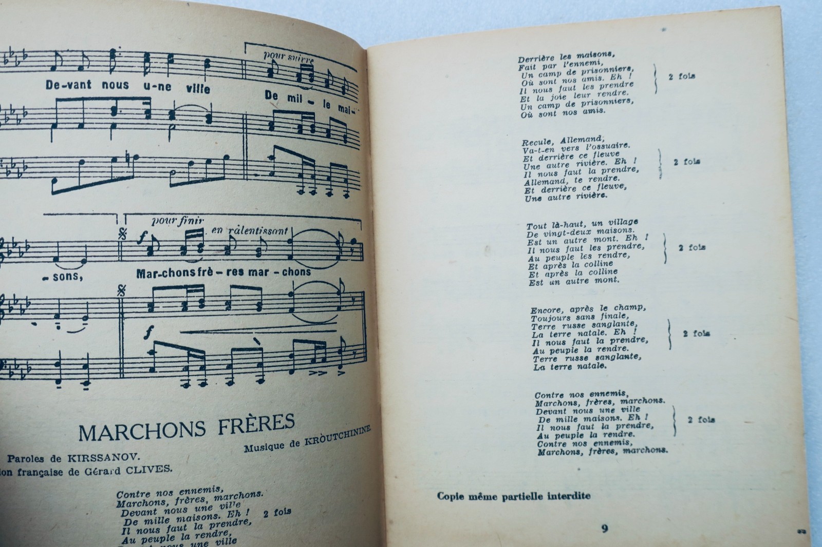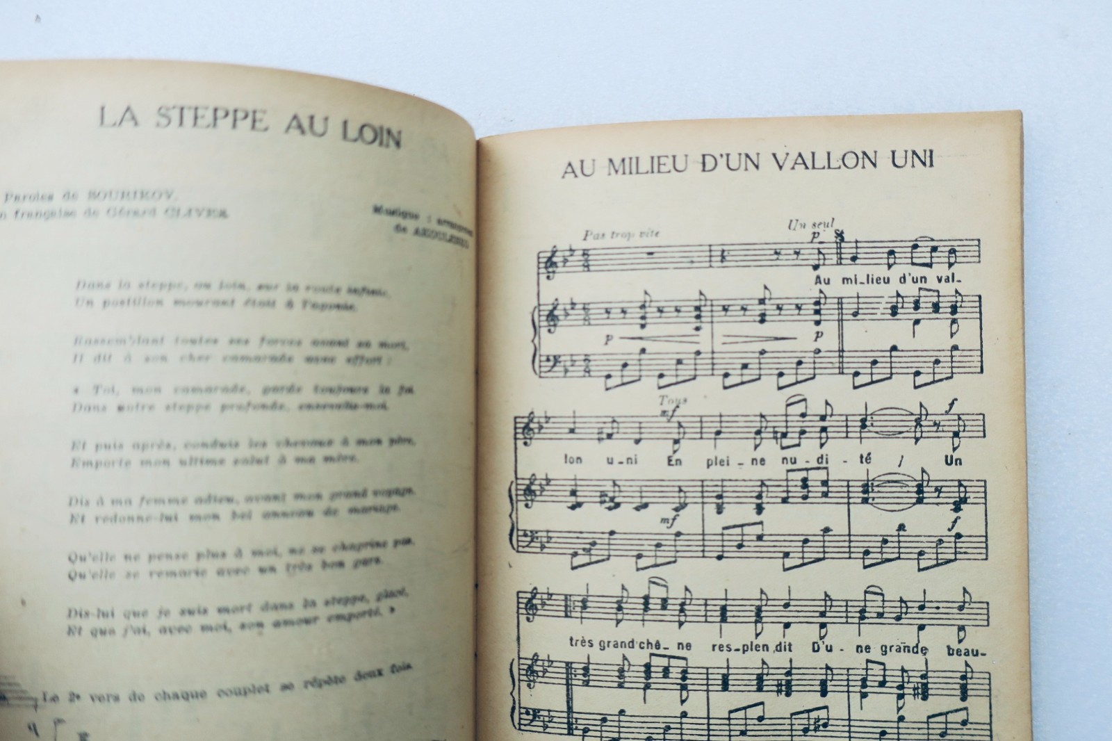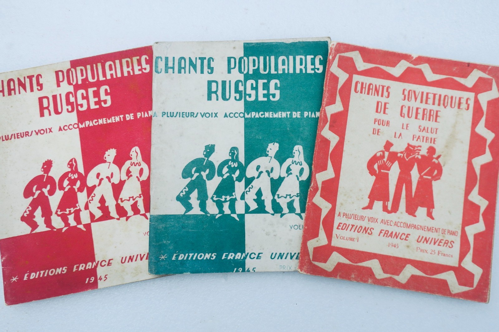 Editions France univers: 1945. chants populaires RUSSES. édition militaire du commissariat à la défense nationale soviétique, exclusivité pour la France et les colonies, 2 volumes, couverture souple à l’agrafe 15,7 x 12 cm. 48 & 43 pp.