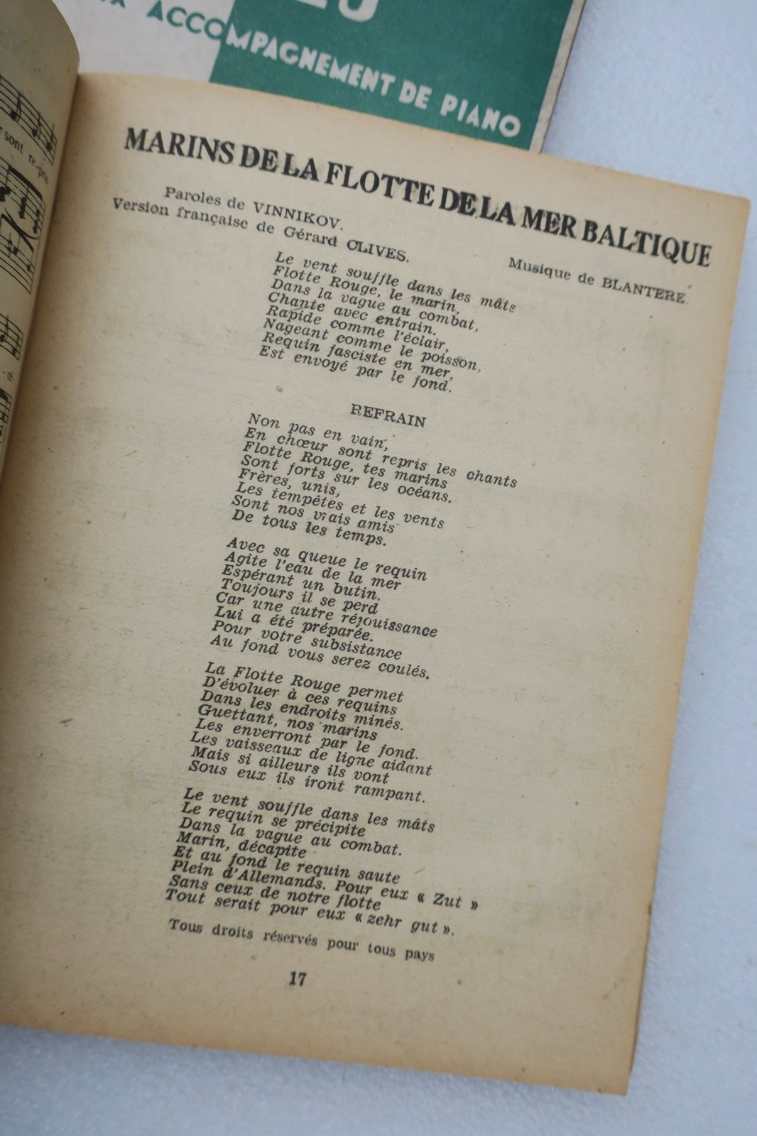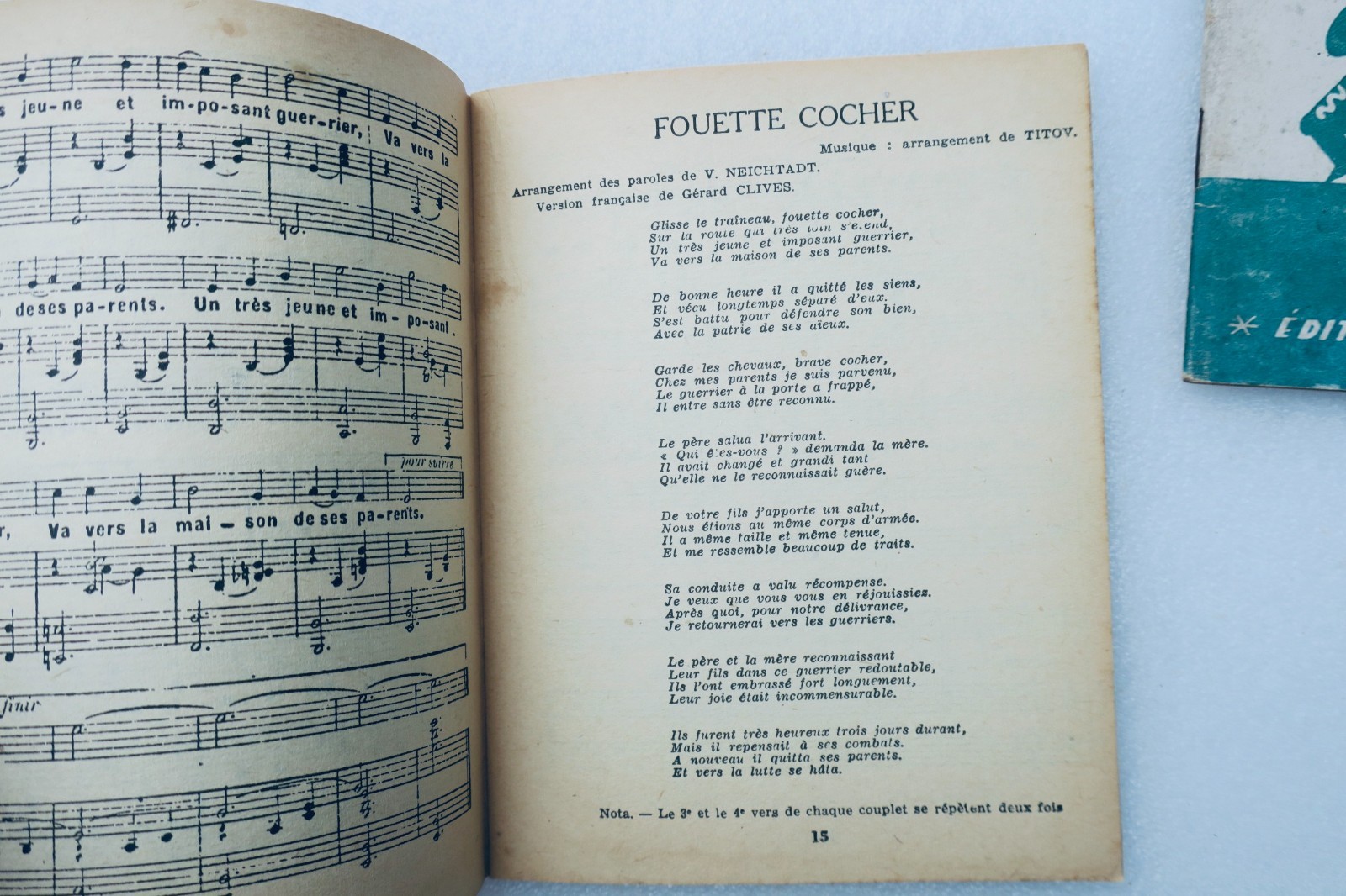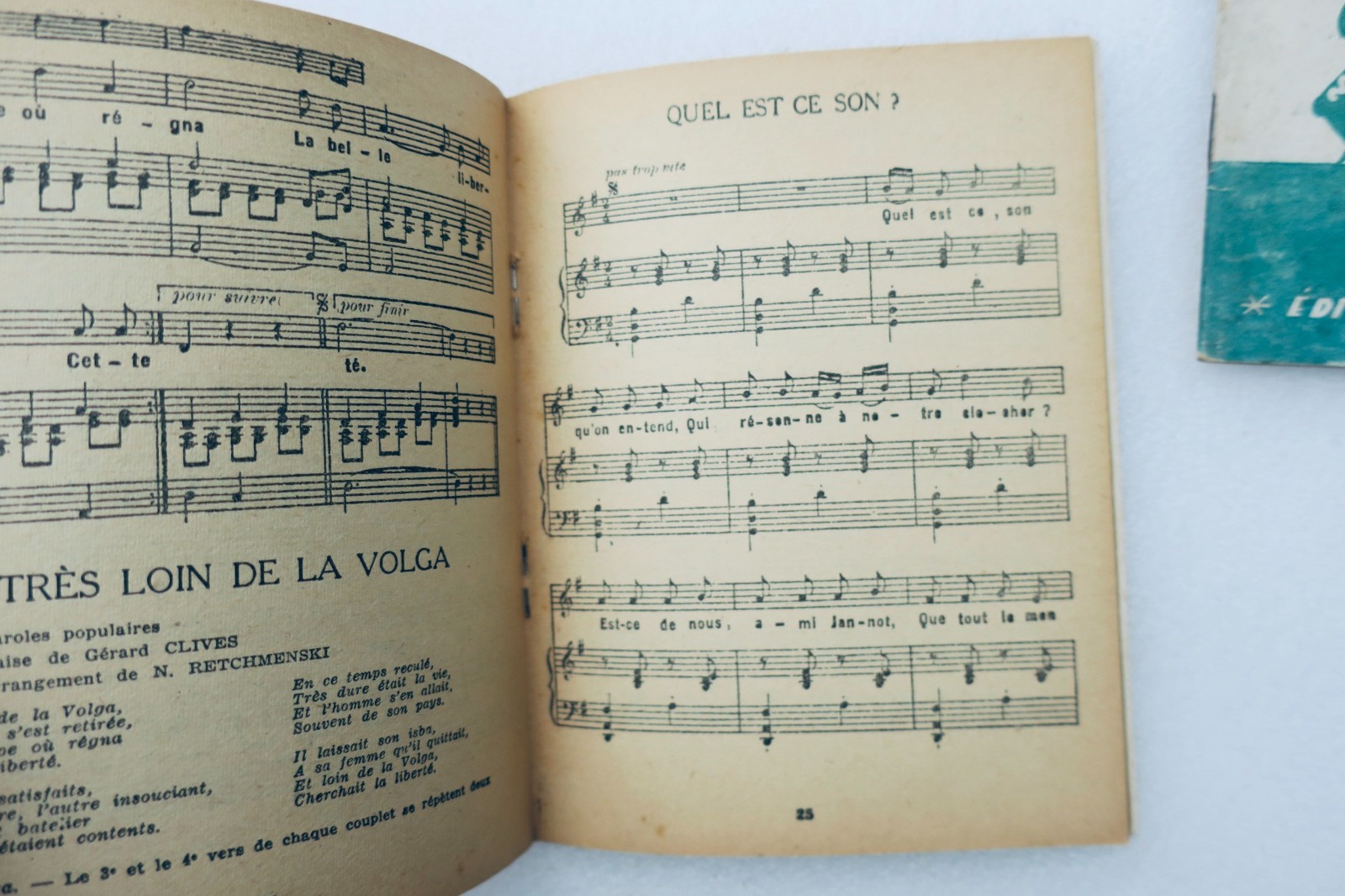 Editions France univers: 1945. chants populaires RUSSES. édition militaire du commissariat à la défense nationale soviétique, exclusivité pour la France et les colonies, 2 volumes, couverture souple à l’agrafe 15,7 x 12 cm. 48 & 43 pp.