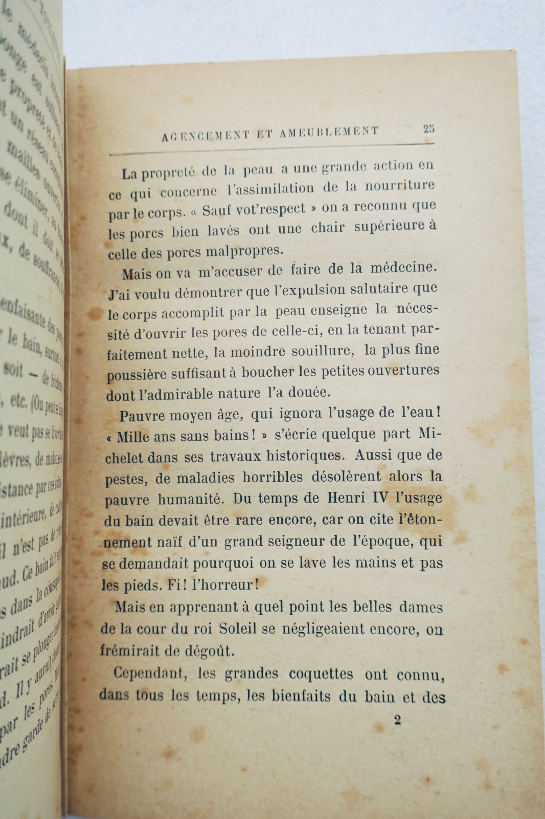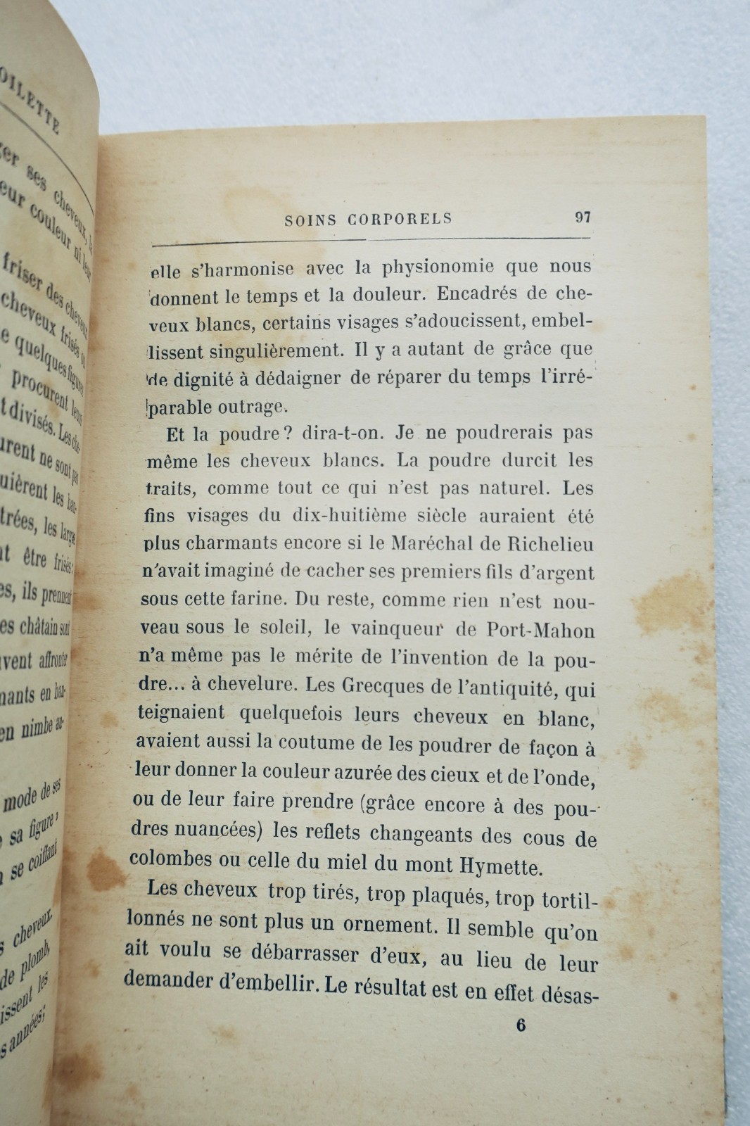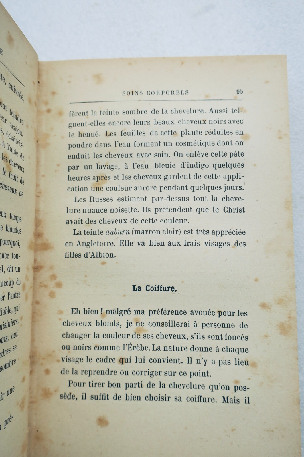 Chevelure, la bouche, les dents, la voix, les yeux, le nez, l’oreille, la main, les ongles, le pied, les dessous de la toilette : corset, jarretelles, l’alimentation, de l’habillement, du maquillage, des parfums, des bijoux et des tissus…