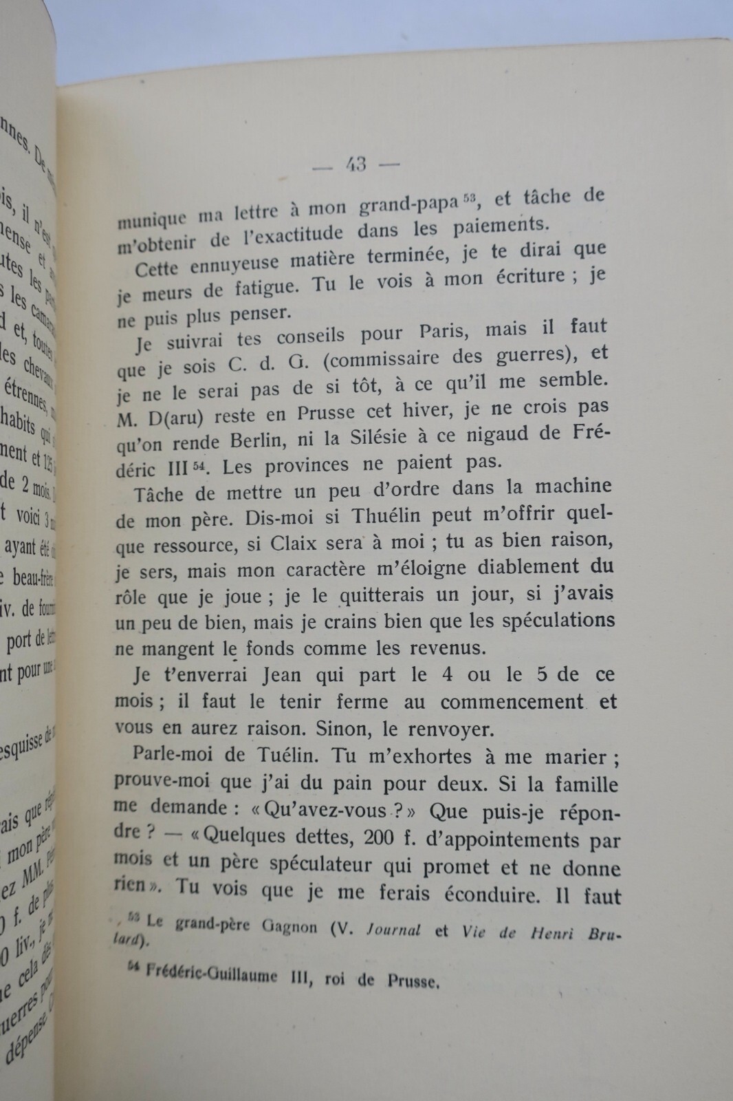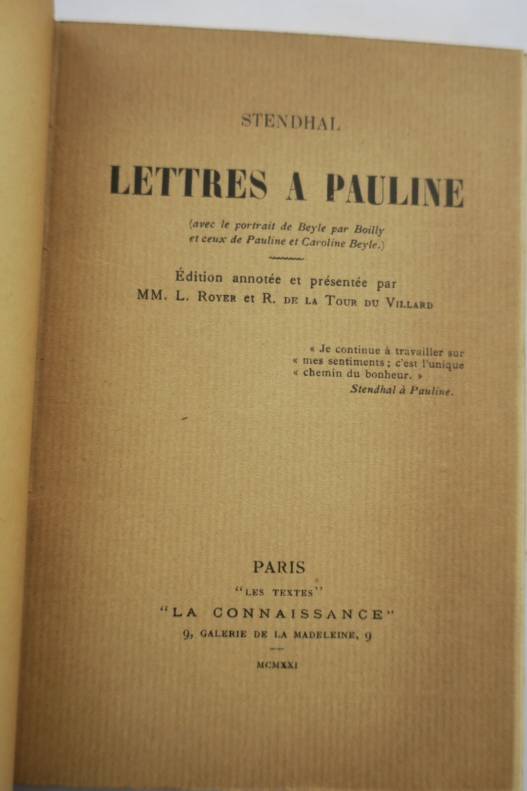 1921 Ed. de la connaissance Paris 1921, reliure demi-cuir, tête dorée, mors fissurés, couvertures & dos conservés, intérieur frais. in-8°, complet des portraits de Beyle par Boilly et de ceux de Caroline et Pauline Beyle. Edition annotée et présentée par MM. L. Royer et R. de la Tour du Villard