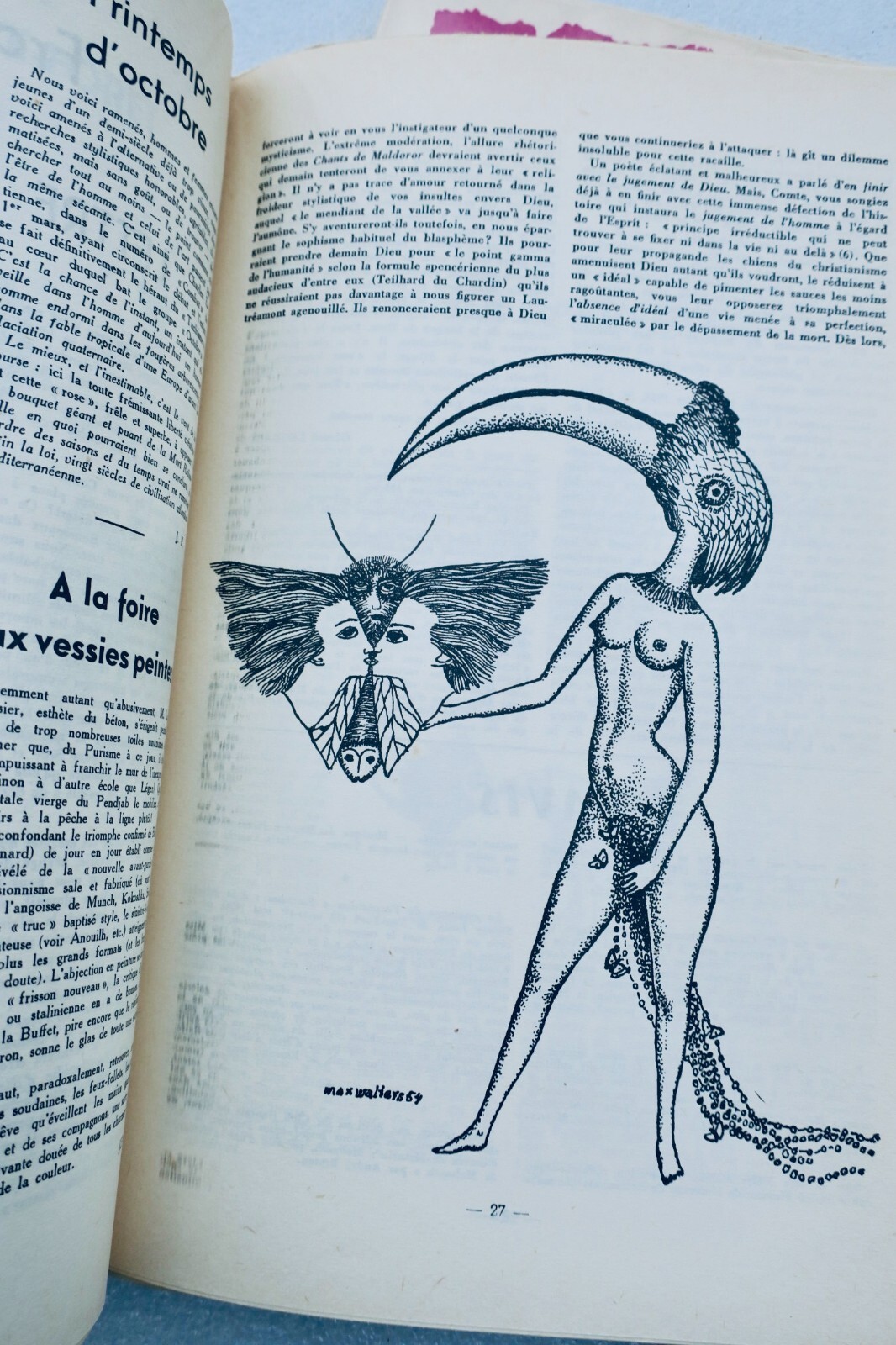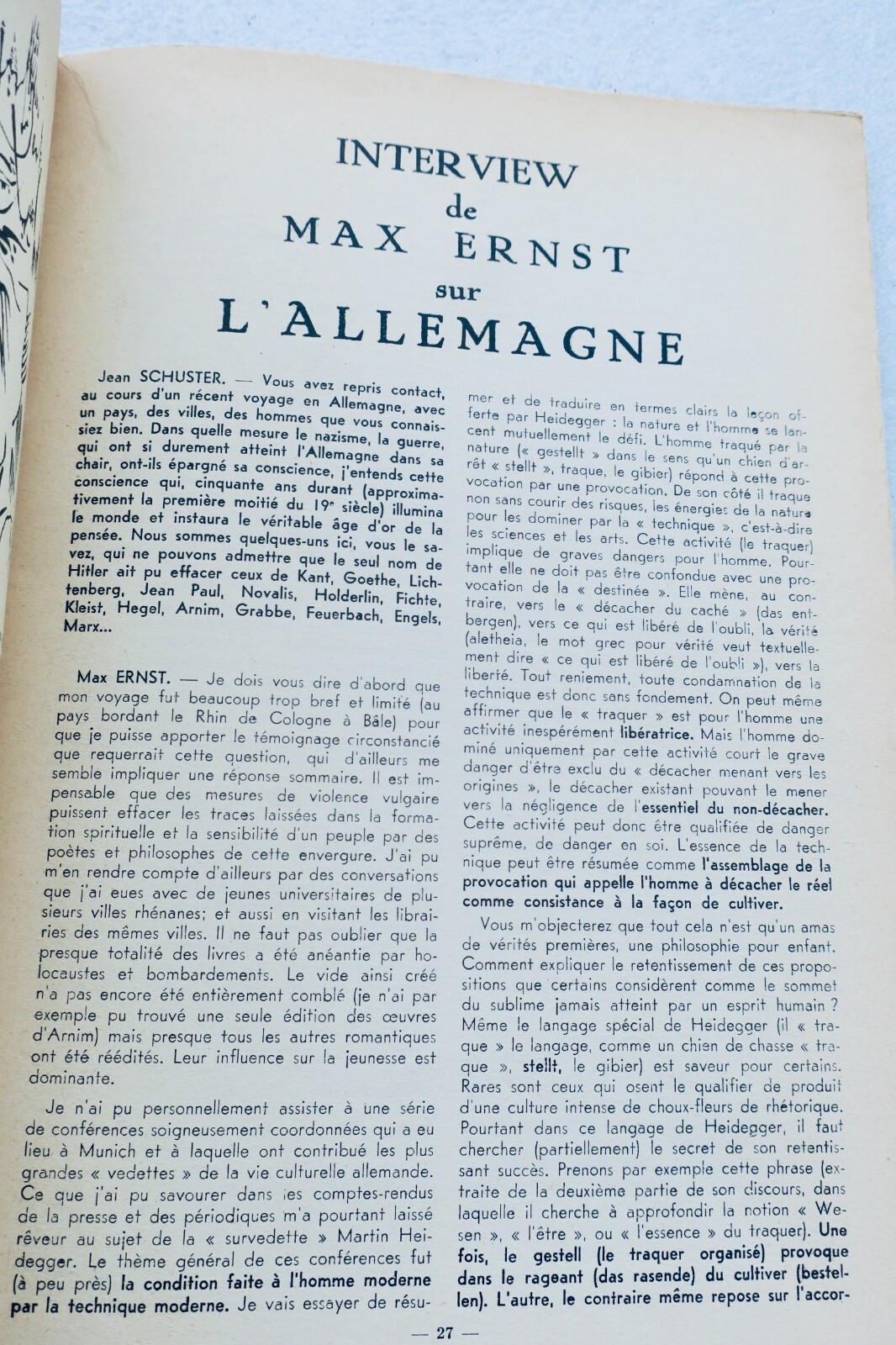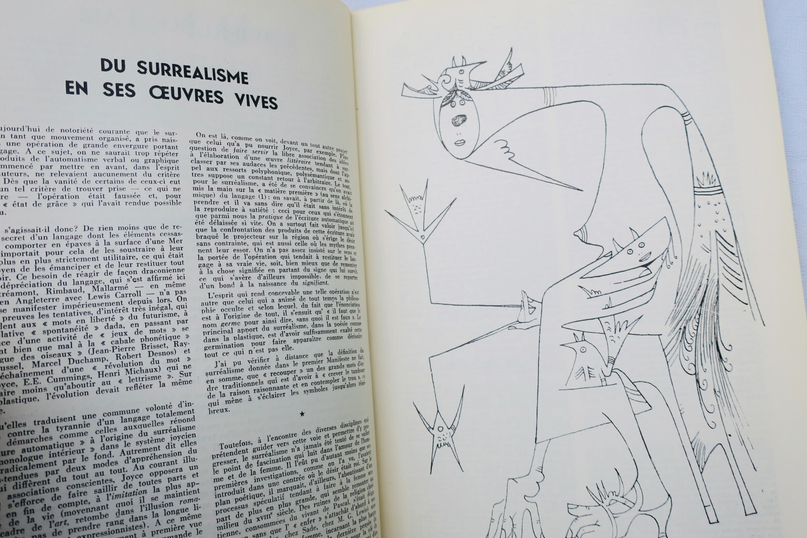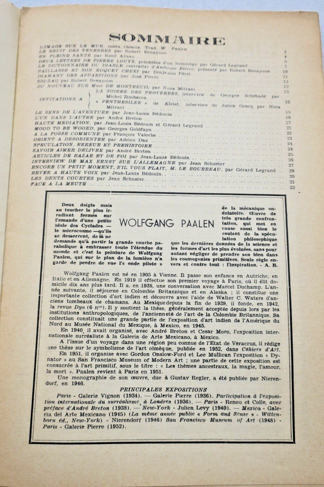 Contributions de Benjamin Péret, André Breton, Jean-Louis Bédouin, Nora Mitrani, Jean Schuster, François Valorbe, Michel Zimbacca, José Pierre, Georges Goldfayn, Adrien Dax, René Alleau, André Pieyre de Mandiargues, Jean-Claude Hemery, Charles Fort, Eugène Ionesco. Nombreux dessins et illustrations, notamment les couvertures : N°1, novembre 1953) : Simon Hantaï n°2, février 1954 : Paalen n°3, mai 1954 : Max Walter Svanberg n°4, janvier 1955 : Wifredo Lam.