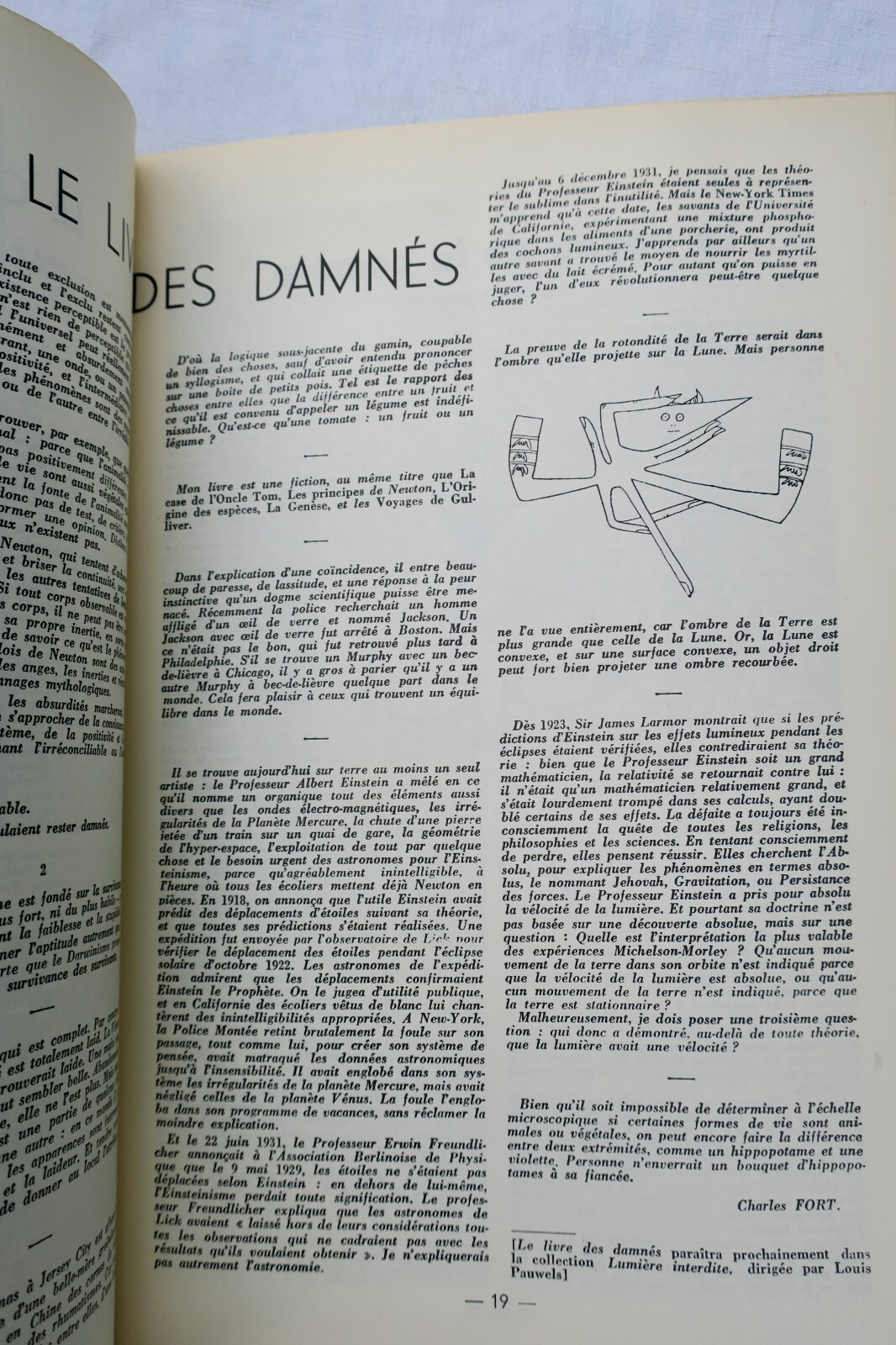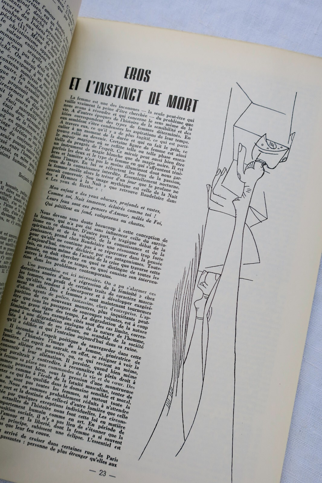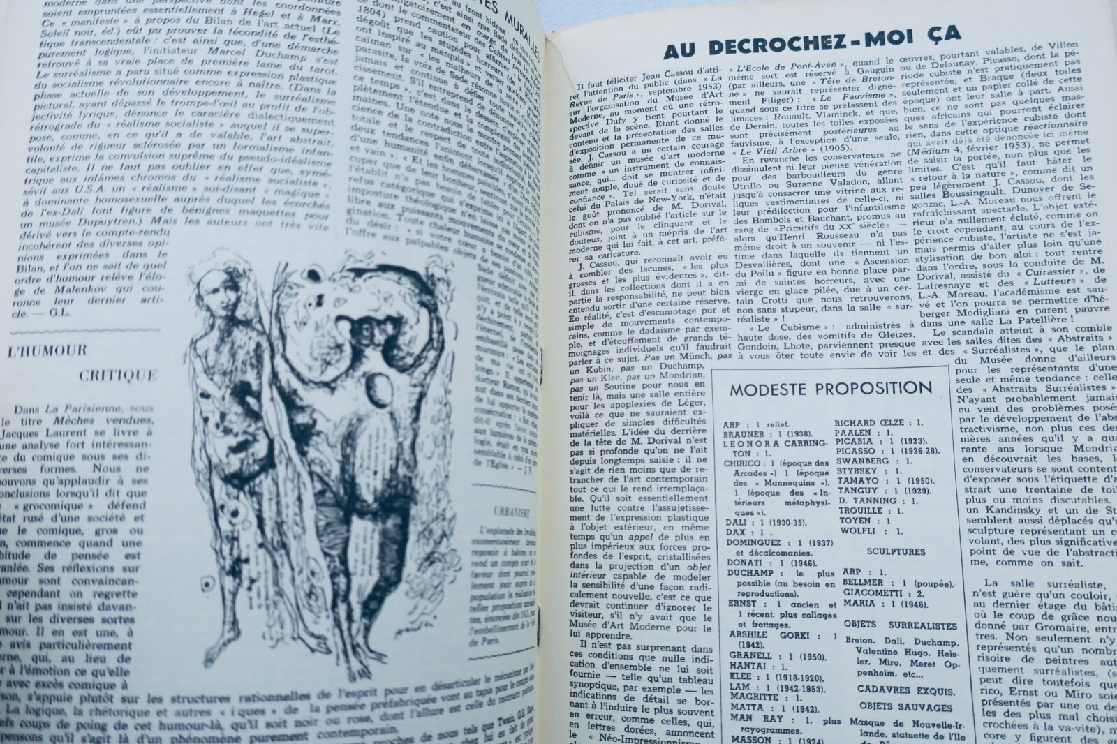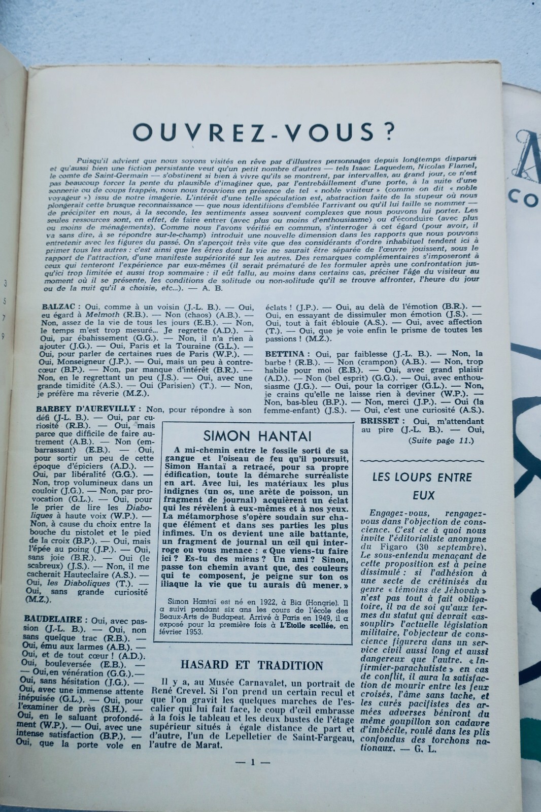 Contributions de Benjamin Péret, André Breton, Jean-Louis Bédouin, Nora Mitrani, Jean Schuster, François Valorbe, Michel Zimbacca, José Pierre, Georges Goldfayn, Adrien Dax, René Alleau, André Pieyre de Mandiargues, Jean-Claude Hemery, Charles Fort, Eugène Ionesco. Nombreux dessins et illustrations, notamment les couvertures : N°1, novembre 1953) : Simon Hantaï n°2, février 1954 : Paalen n°3, mai 1954 : Max Walter Svanberg n°4, janvier 1955 : Wifredo Lam.