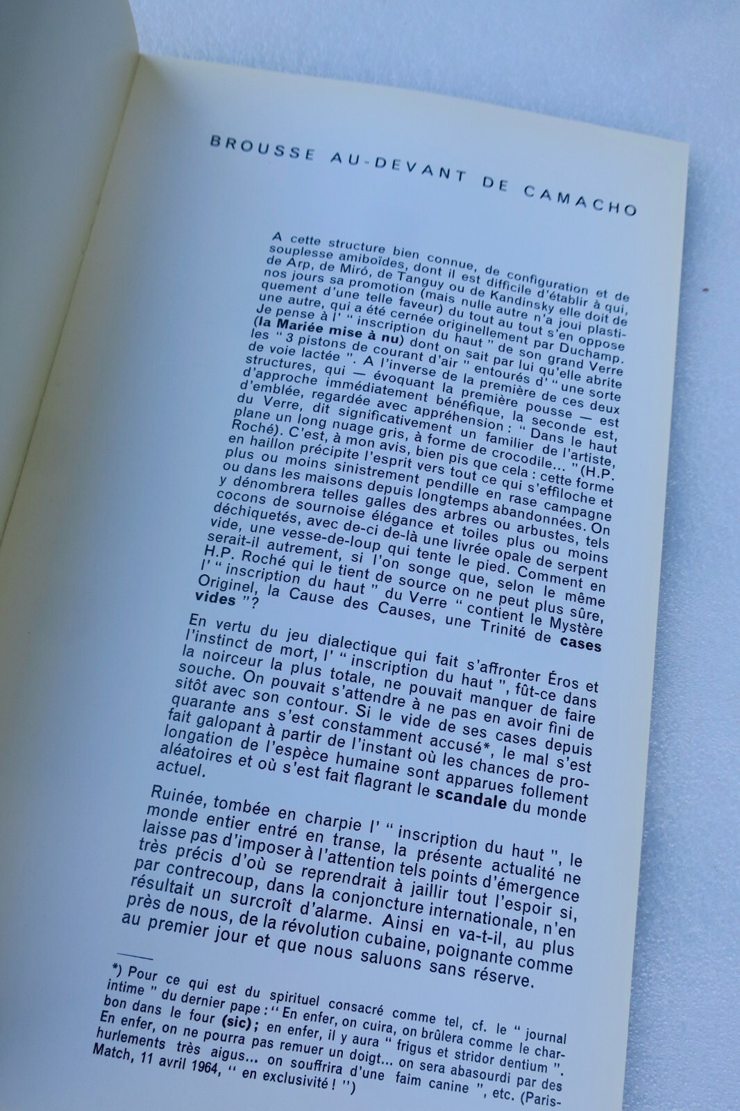 Paris Galerie Mathias Fels, 1964, In-8°, broché, Edition originale Préface de Breton « Brousse en devant de Camacho » en édition originale. Lithographie originale de Camacho tirée sur papier brun en couverture. 4 reproductions et portrait de l’artiste.