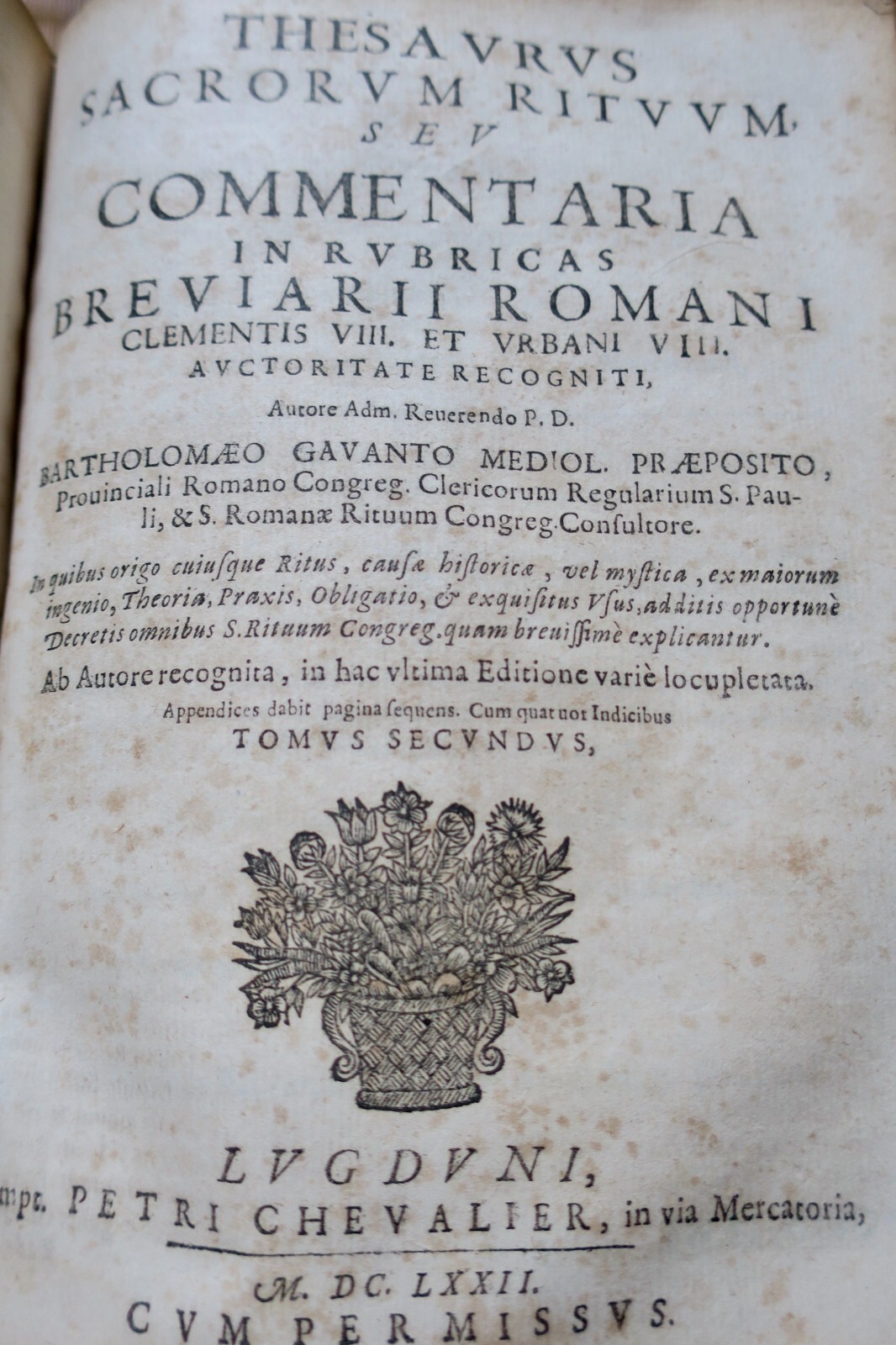THESAURUS SACRORUM RITUUM SEU COMMENTARIA IN RUBRICAS MISSALIS ET BREVIARII ROMANI (à la suite) Enchiridion sev Manvale episcoporum.. (2 tomes).