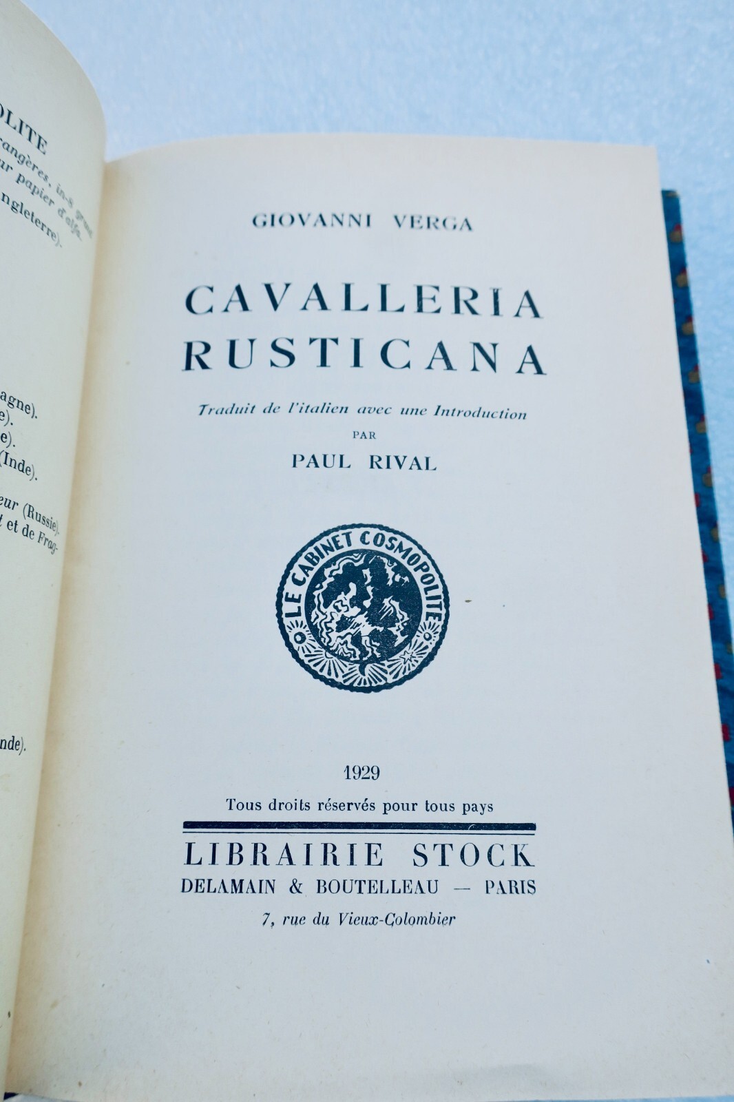 Librairie Stock, 1929. In-12, 219 pp., reliure demi-cuir Traduit de l’italien avec une introduction par Paul RIVAL. Edition originale & exemplaires numérotés sur alfa satiné d’Outhenin-Chalandre