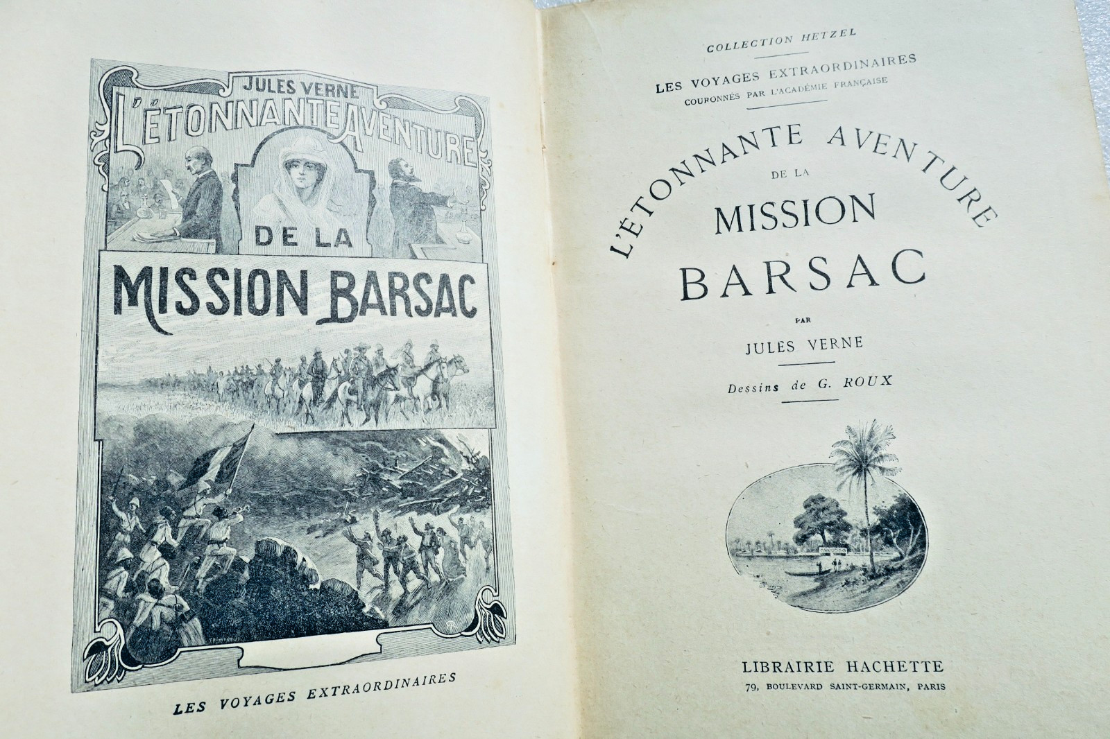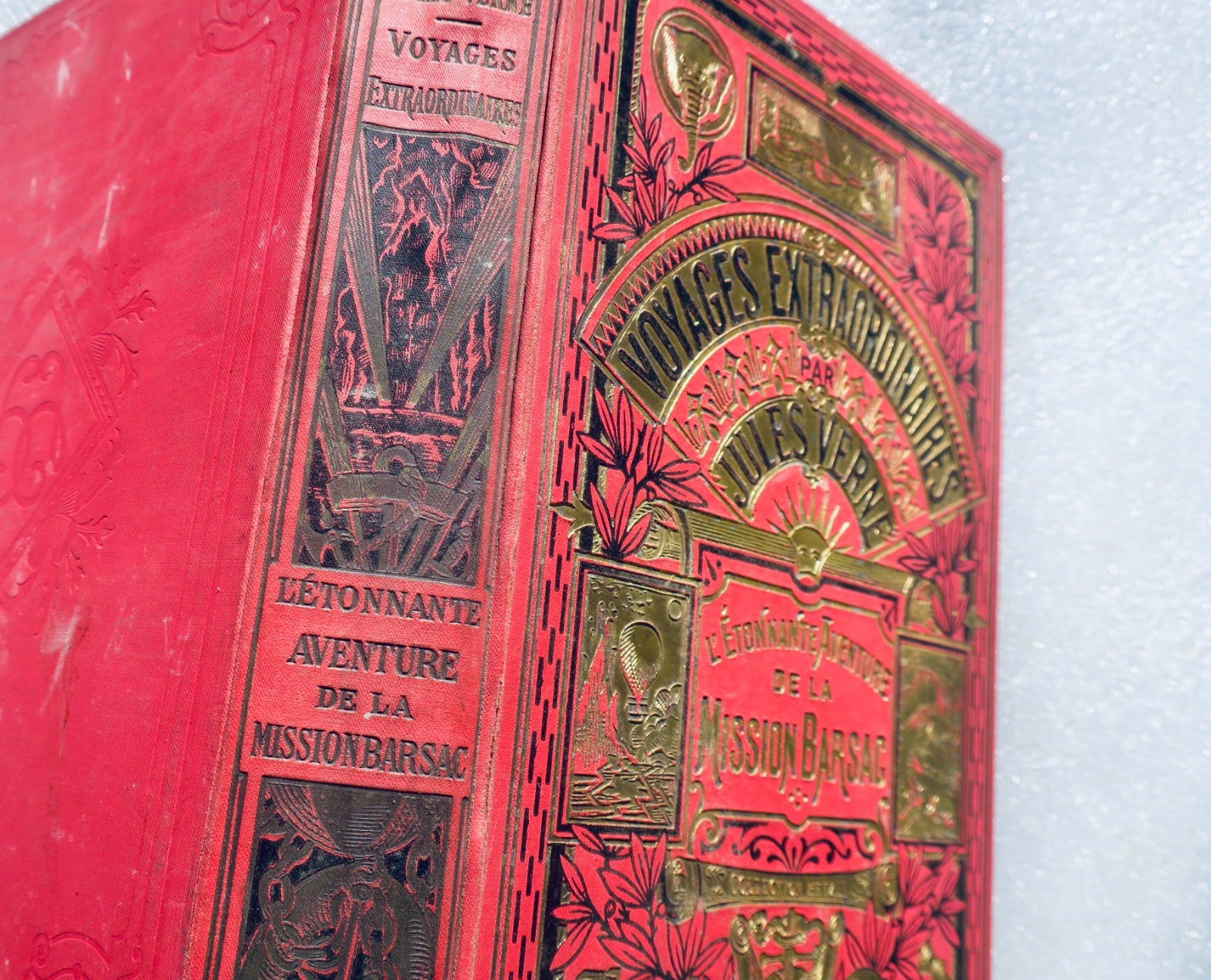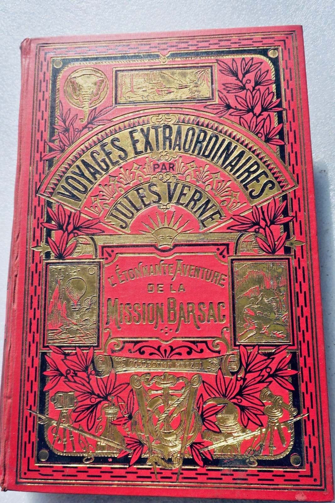 Collection Hetzel, librairie Hachette, in-4°, belle reliure percaline à l’éventail et à l’éléphant, tranche supérieure dorée. Illustré de dessins de G. Roux. 492 pp., petites usures en coiffe supérieure